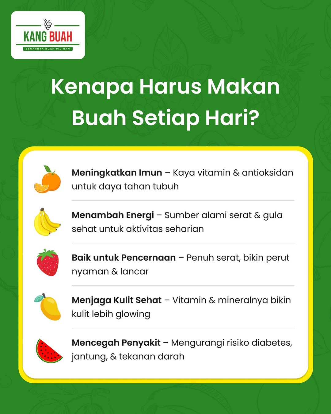 Tunggu apa lagi? Yuk, cek pilihan buah segar kami hari ini dan mulailah hidup lebih sehat bersama Kang Buah!